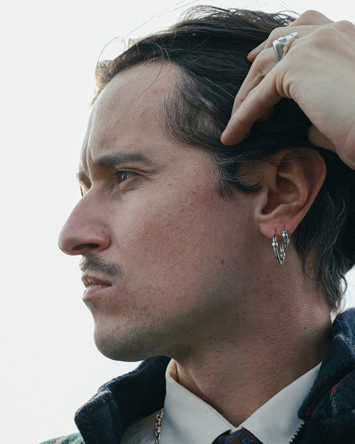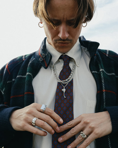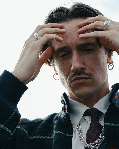 Our SS26 Editorial brings together new and existing pieces layered together with a focus on Silver 925. Captured atop a rooftop in Vancouver’s Chinatown, the story centres on form and material: polished surfaces, and defined edges. New to the SS26 season are the Finner Hoop earrings. Featuring a large 20mm hoop and a smaller 13mm size option. Rounding out the look are the Cuban link signet and F/CE collaboration pieces.