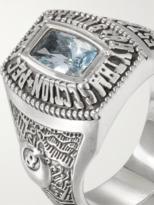 MAPLE is proud to create this custom class ring to honour Rhythm Section International's commitment to the music industry and their roots begining in a Peckham pool-hall. The ring is made from sterling silver 925 and features an Aqua marine topaz, symbolizing the label's dedication to creating a unique and distinctive sound. The ring is a beautiful piece of jewelry that will serve as a reminder of the incredible contributions that Rhythm Section International has made to the music world.