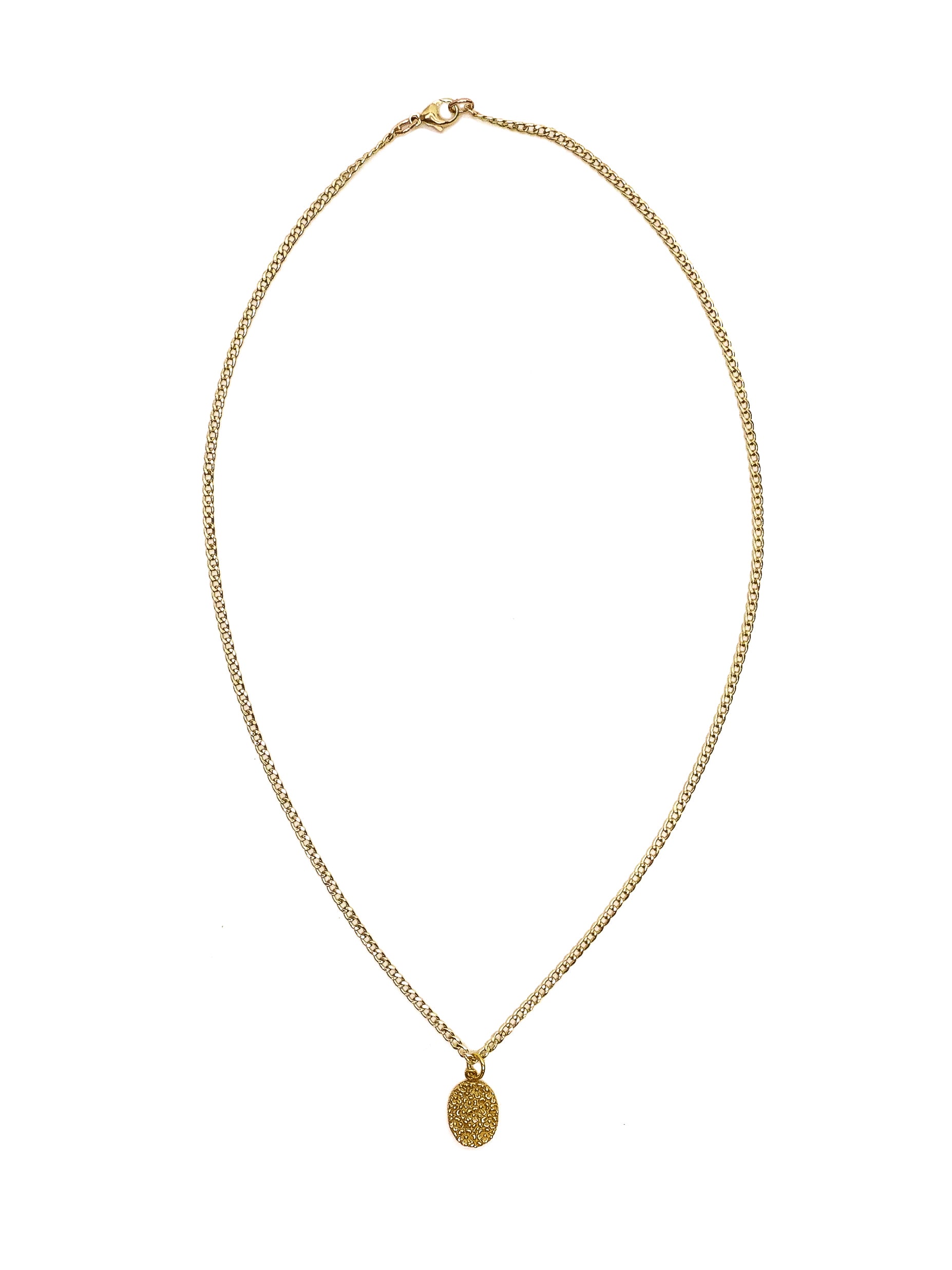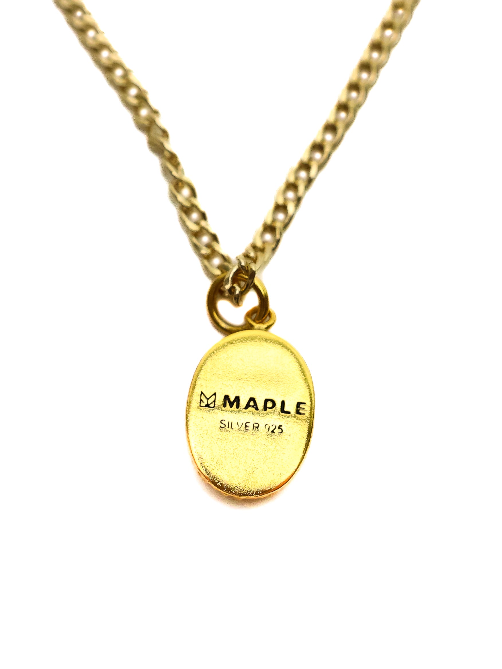 An oval pendant engraved with MAPLE’s signature Floral pattern, paired with a 2.5mm curb chain in Silver 925 with a 14K Gold plating and finished with a lobster clasp.