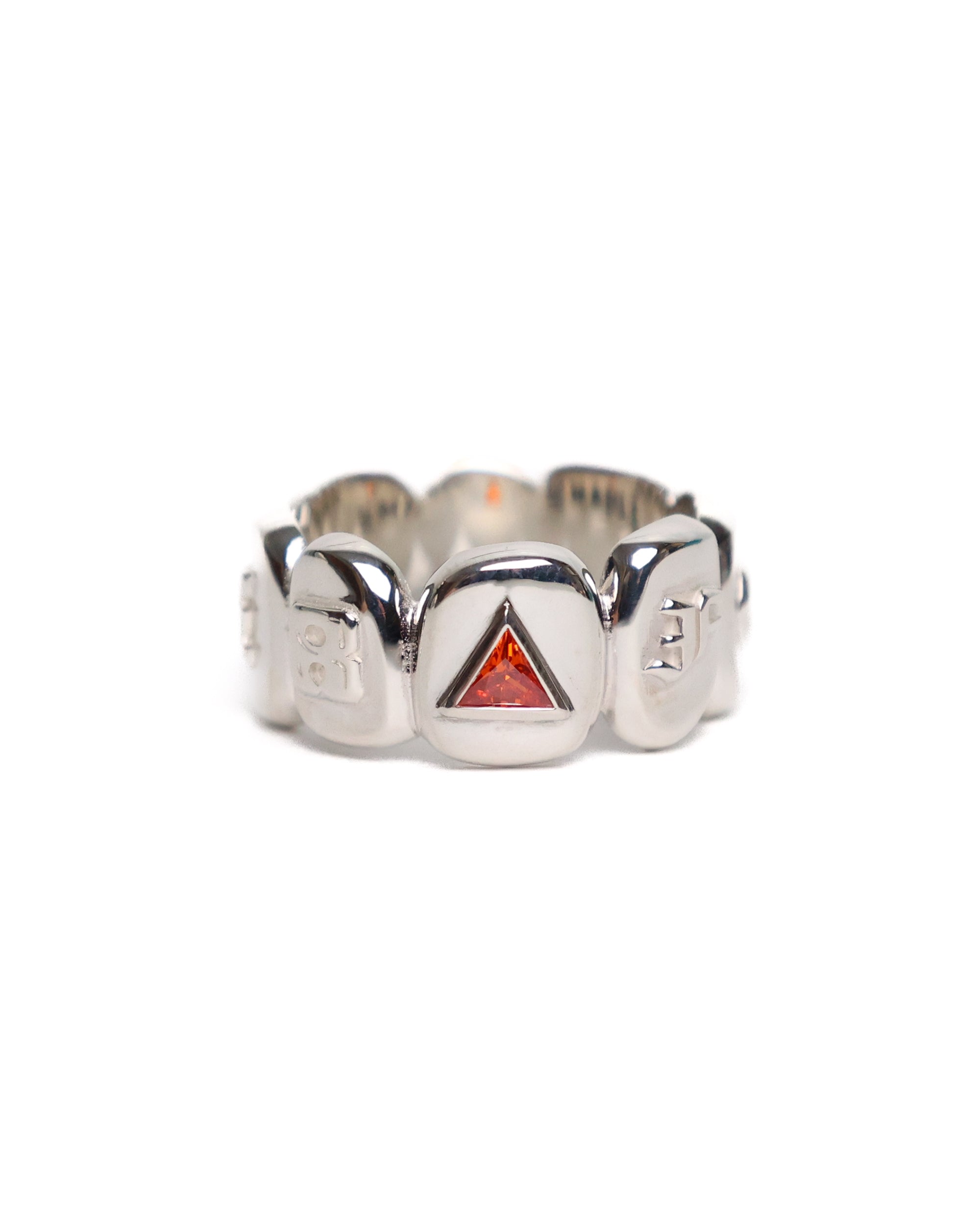 The MAPLE Grill ring features all tooth shapes and sizes, with raised 3D text reading "Forever." It is adorned with a triangle orange zircon stone.