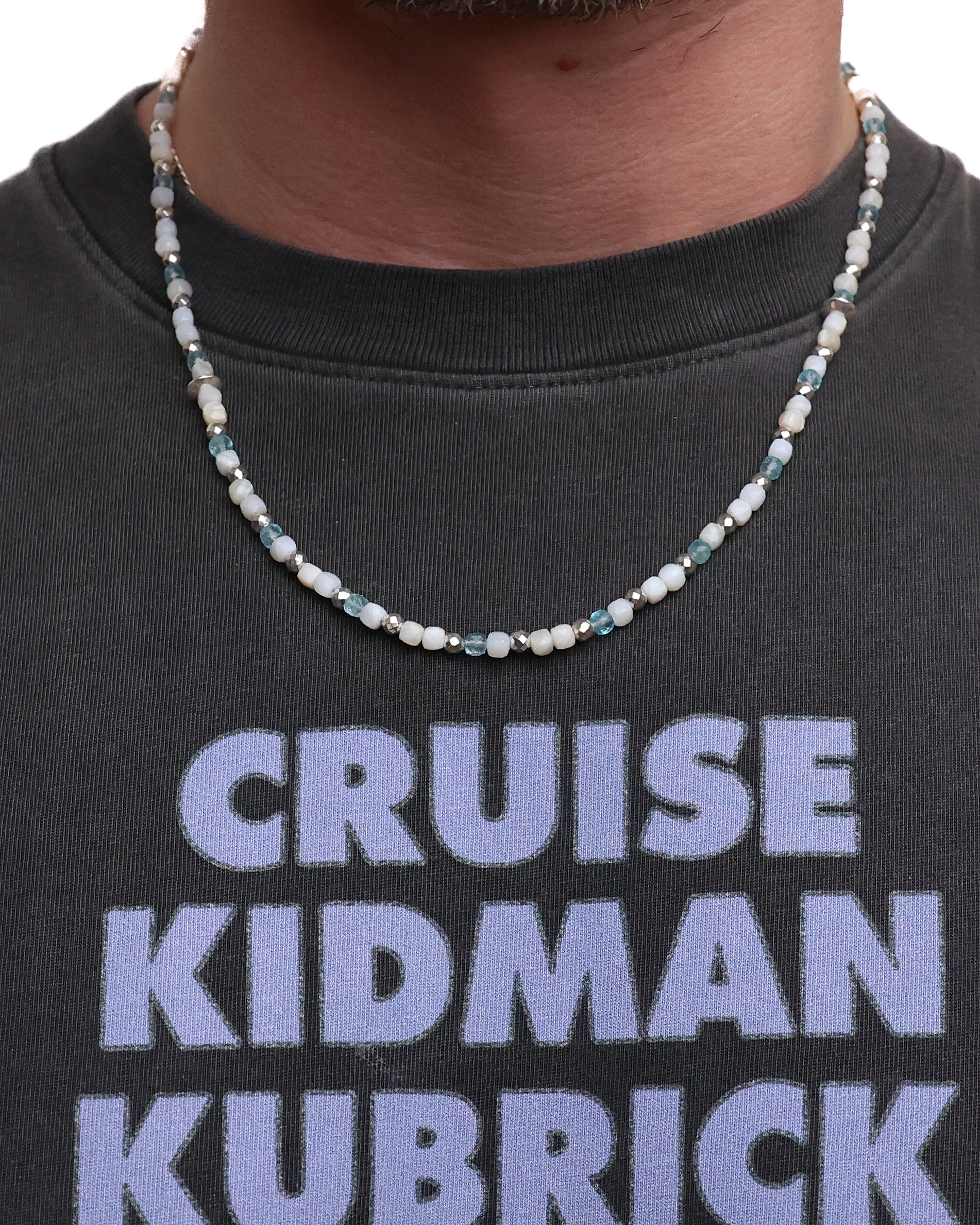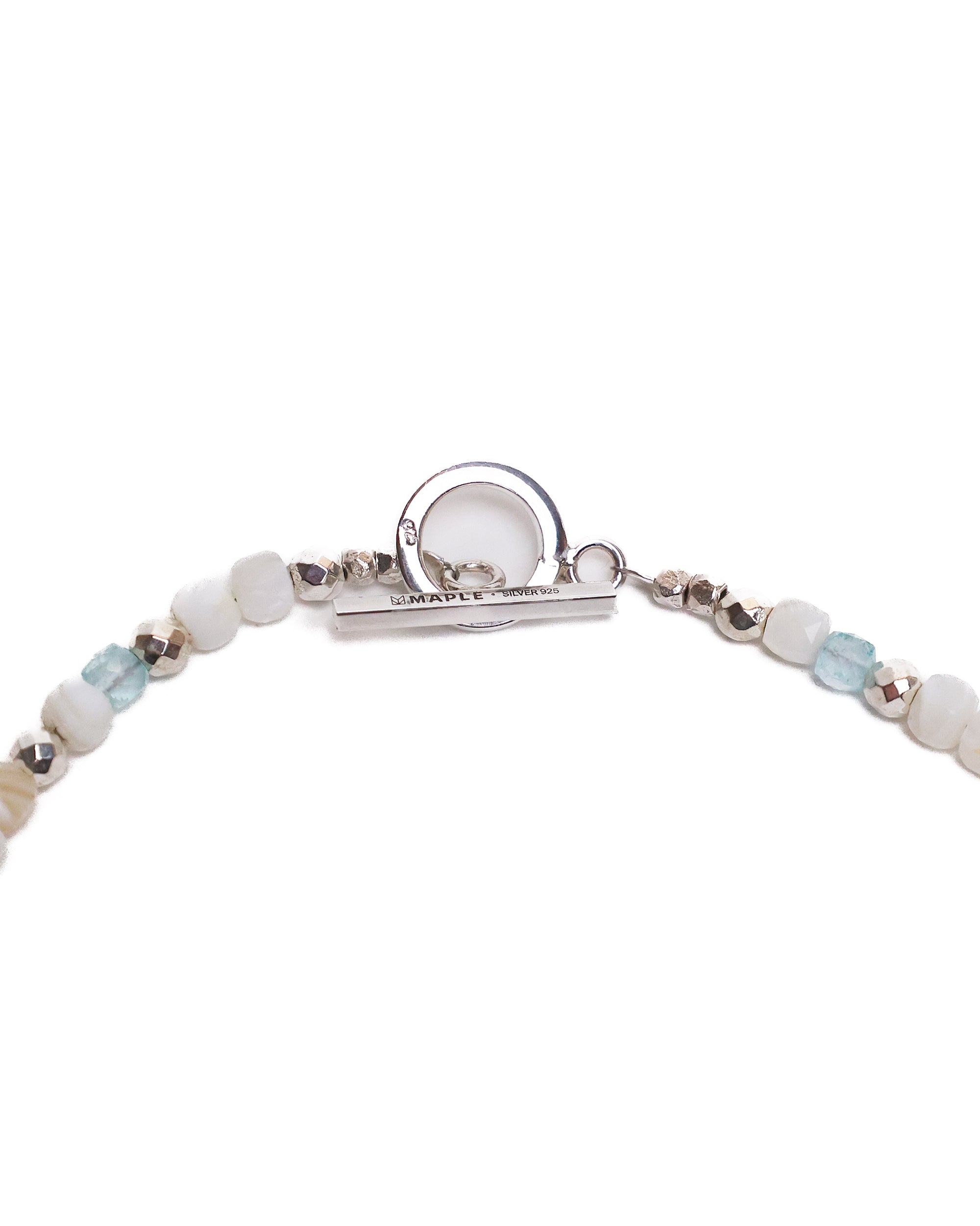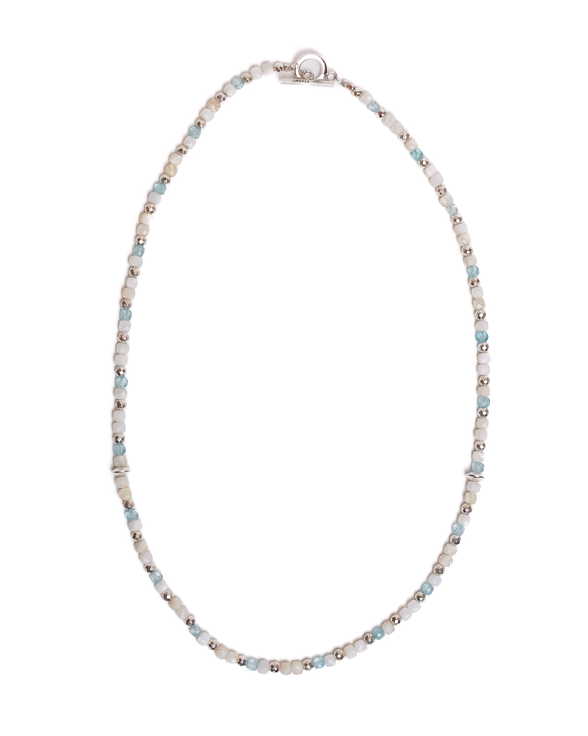 In the off white colourway, mother of pearl, blue topaz, pyrite, and Silver 925 beads are brought together and secured with a toggle clasp engraved with the MAPLE logo and finished with Silver 925 hallmarking.