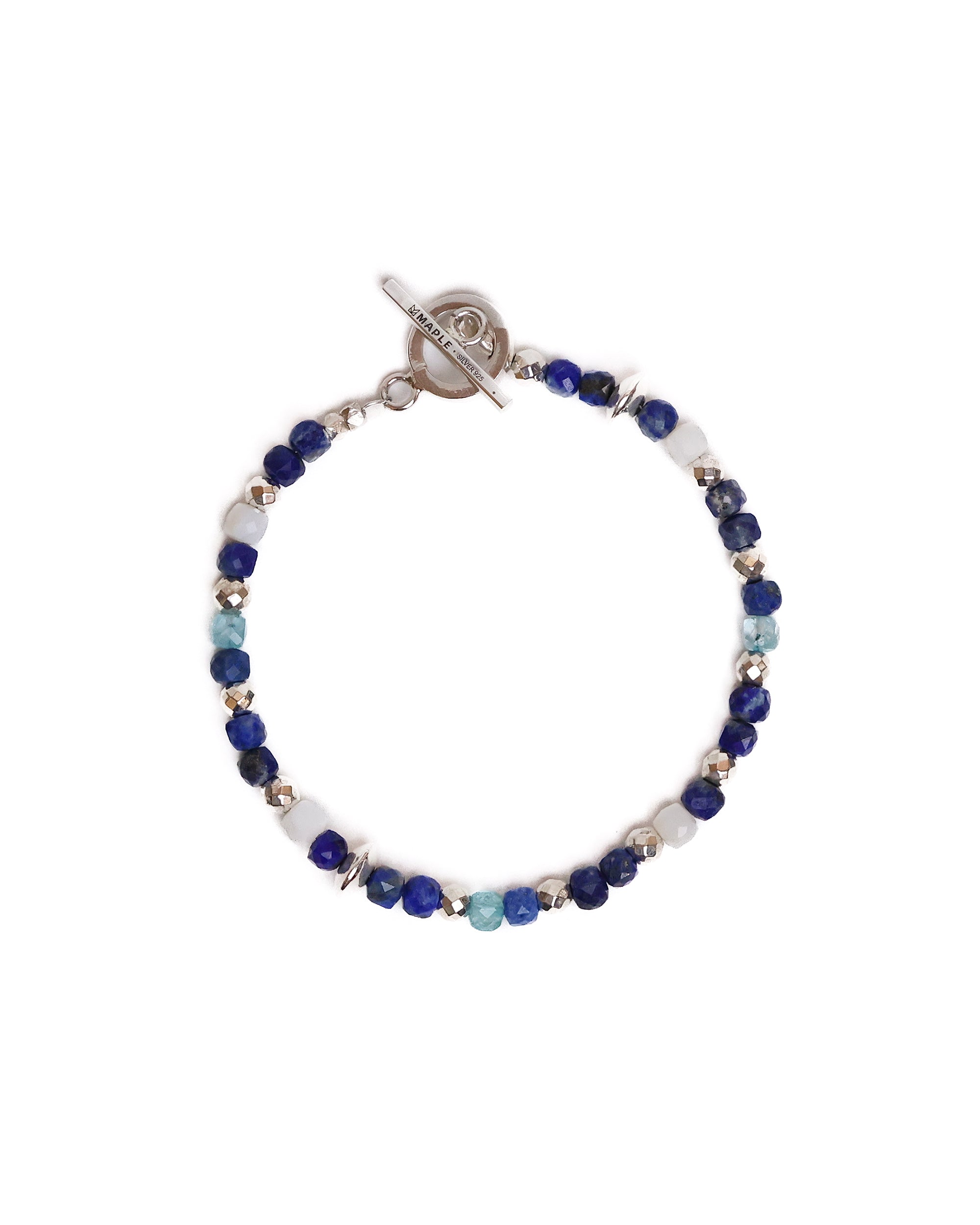 In the navy colourway, lapis lazuli, blue topaz, mother of pearl, pyrite, and Silver 925 beads are brought together and secured with a toggle clasp engraved with the MAPLE logo and finished with Silver 925 hallmarking.