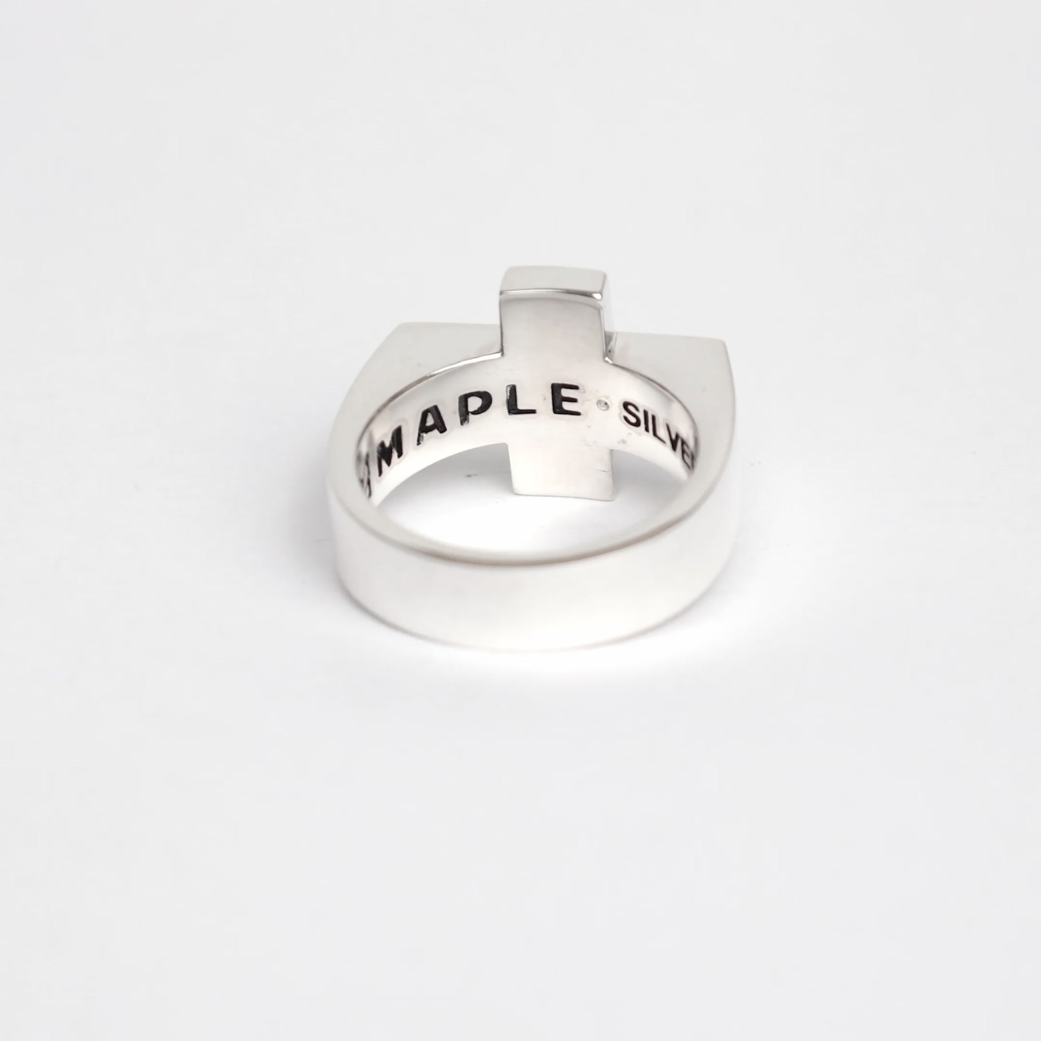 The Cross Signet features a flat polished face with a round turquoise stone set in the center. Embellished with an "M" on the side and made from solid silver 925. Hallmarking and MAPLE logo inside.